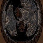An artistic portrait features a woman with textured, dark skin, surrounded by a circular frame resembling wood. Her striking eyes contrast against the earthy tones, creating a captivating visual.