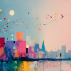 A vibrant cityscape at sunset features colorful buildings reflected in water. Hearts and trees in bright hues float through the sky, creating a whimsical and dreamy atmosphere.