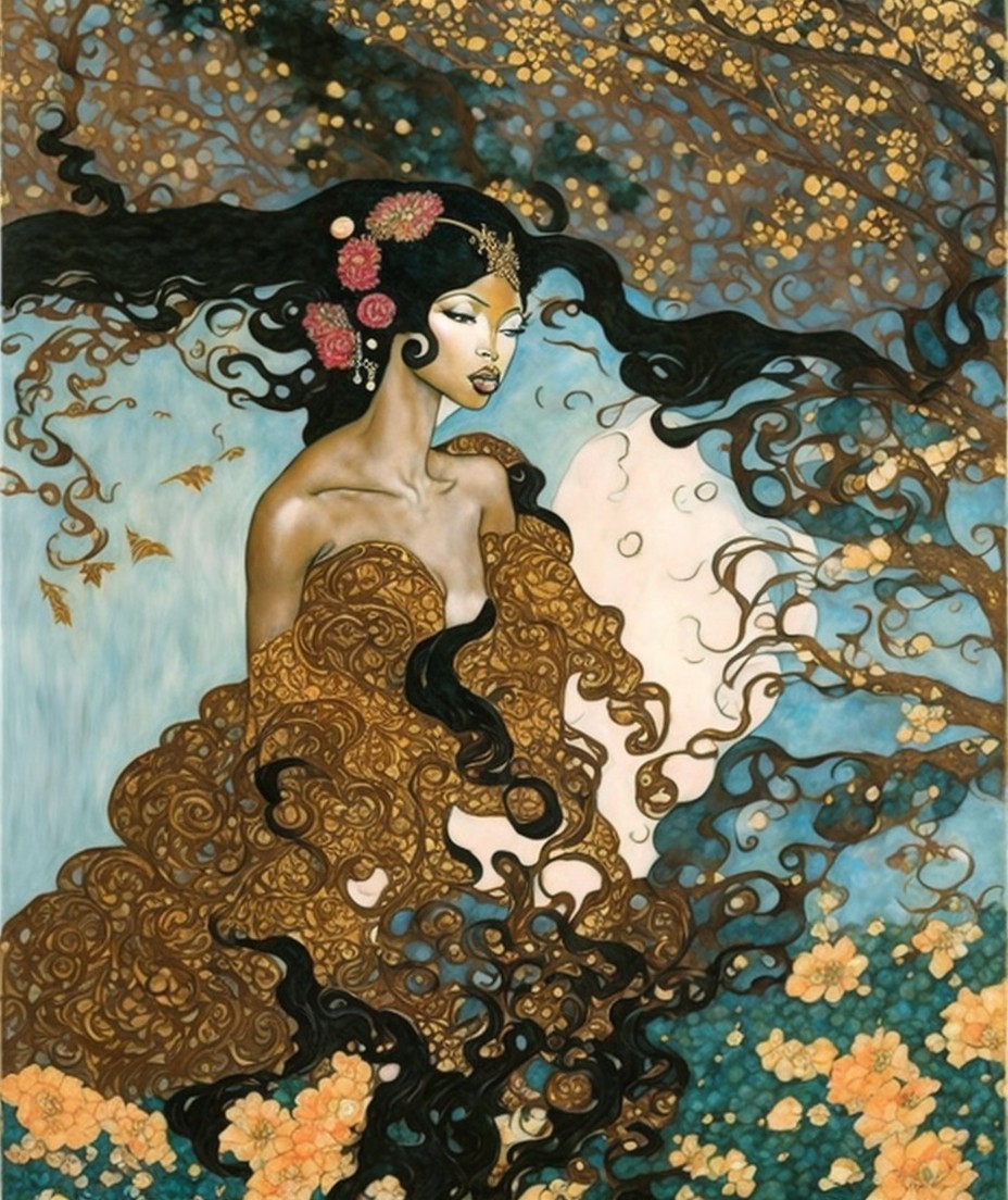 Prompt: A full colored painting of a beautiful black woman emerging from the twilight wearing a elaborate headdress, whimsical, beautiful, poignant, colors rose, gold, rust, burgundy, black.