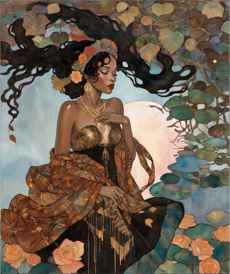 + Prompt:A full colored painting of a beautiful black woman emerging from the twilight wearing a elaborate headdress, whimsical, beautiful, poignant, colors rose, gold, rust, burgundy, black.