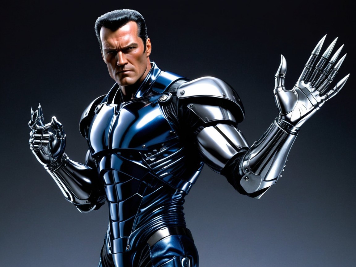 Prompt: "Make a superhero out of there terminator T-1000 in the style of jim lee. He should have a liquid metal blade for an arm. His hands should be liquid metal claws"