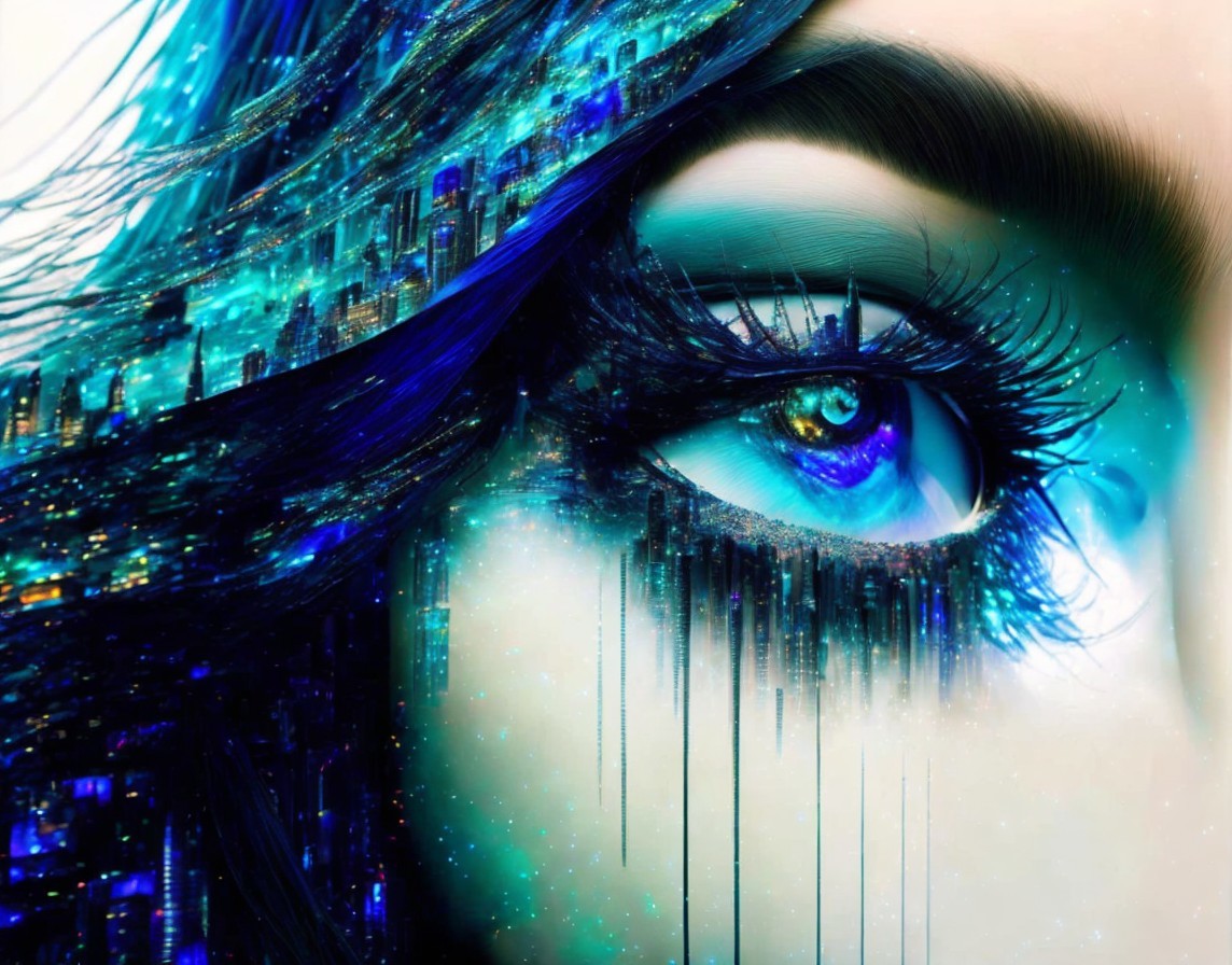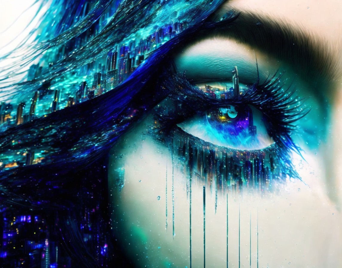 The image features a striking close-up of an eye, intertwined with a vibrant cityscape and cosmic elements, creating a mesmerizing blend of urban and celestial themes.