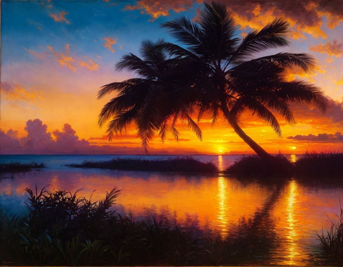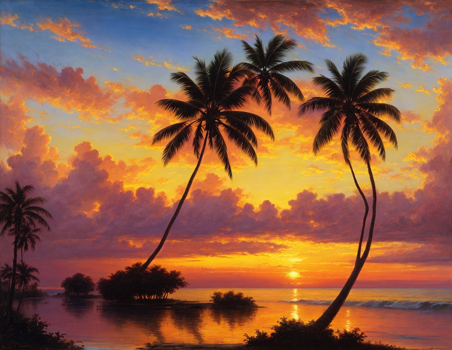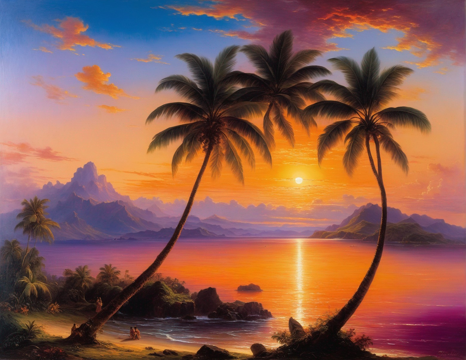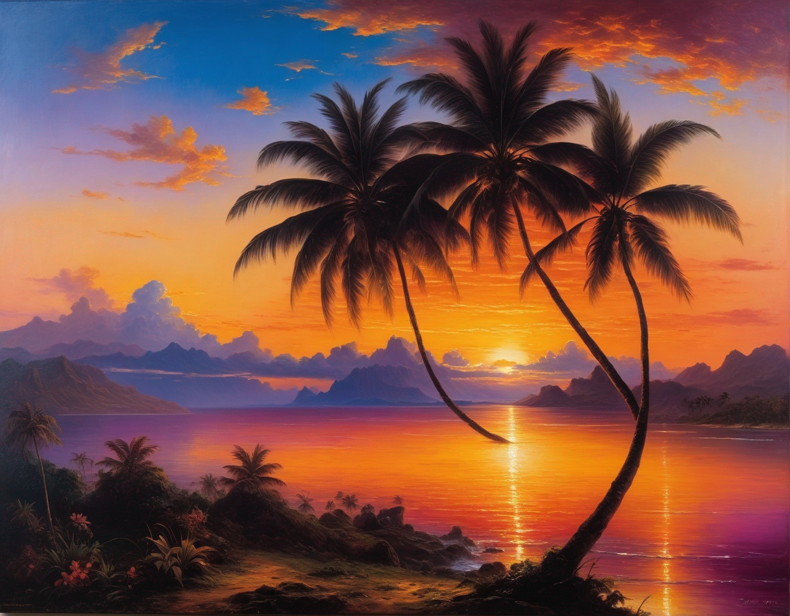 Prompt: "Oil on canvas, wide angle landscape view, a magnificent sunset at Tahiti. Glowing with vibrant hues, glowing with vibrant hues, sky transitioning from warm orange to deep purple. Perfect composition. By Peter Paul Rubens. William Turner. By Pierre-Auguste Cot."