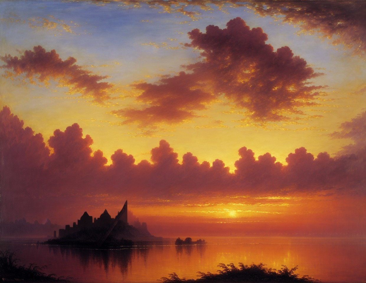 Prompt: Oil on canvas, wide angle landscape view, a mist magnificent sunset at Tahiti. Glowing with vibrant hues, glowing with vibrant hues, sky transitioning from warm orange to deep purple. Perfect composition. By William Turner.