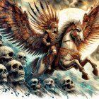 Ehecatl, the Aztec god of the wind, rides a swift horse, with his winged form; skulls line up behind him...