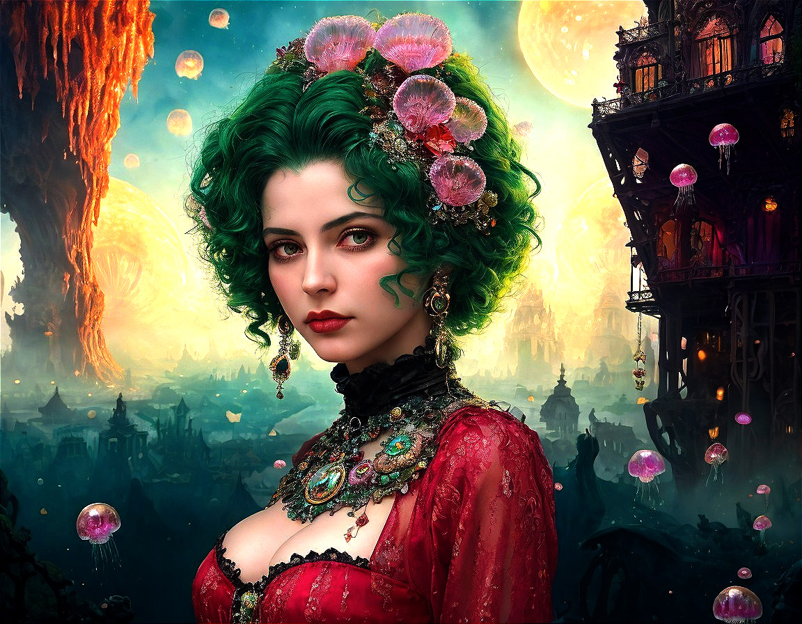 A stunning and detailed photograph captures a surreal gothic village flooded with jellyfish, monsters, and erupting volcanoes. A woman with green hair adorned with rubies walks in a Klimt-style setting under multiple moons. The artwork is hyper-realistic, cinematic, and exquisitely detailed, reminiscent of various renowned artists' styles. The