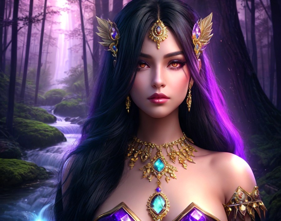 Fantasy portrait of a woman with dark hair, elf ears, and purple eyes, wearing golden and gemstone jewelry in an enchanted forest.