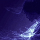 A serene profile of a woman with elegant dark hair, adorned with subtle accessories. She is draped in delicate, flowing fabrics, set against a rich, deep purple background that exudes tranquility.