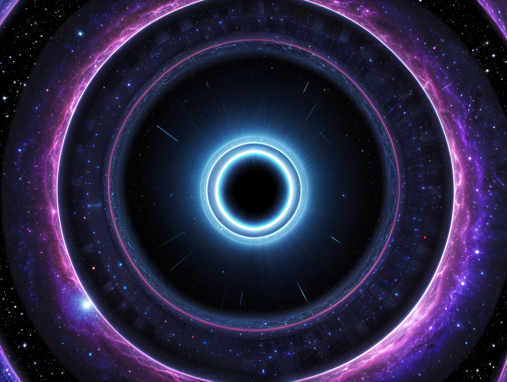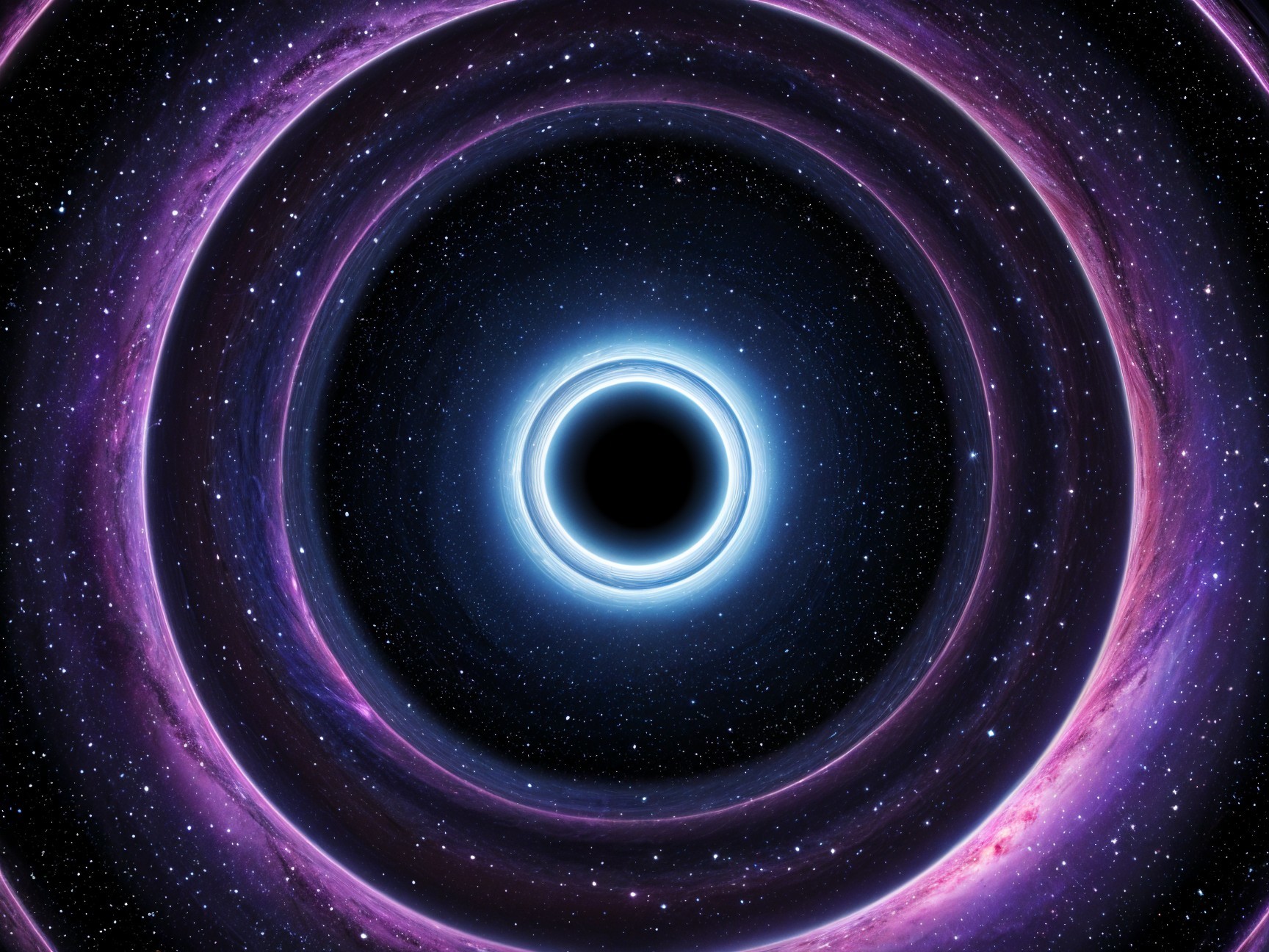 A mesmerizing cosmic scene featuring concentric rings of vibrant purple and blue swirling galaxies, centered around a dark void, evoking the mysterious depths of space and time.