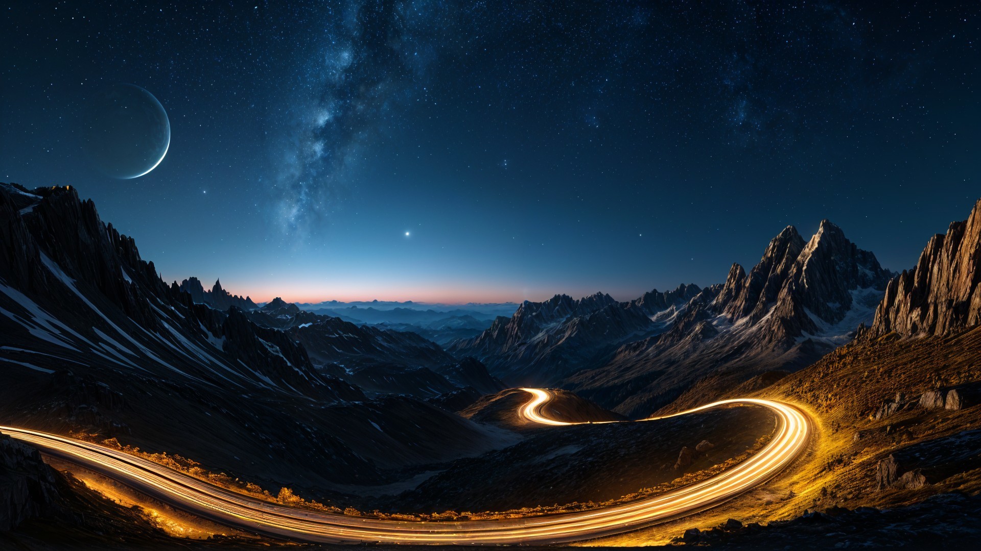 (Try from Stanislav Kozenko) - A breathtaking night scene showcases a winding road illuminated by car lights, surrounded by majestic mountains and a starry sky, with a crescent moon and the Milky Way adding to the cosmic beauty.
