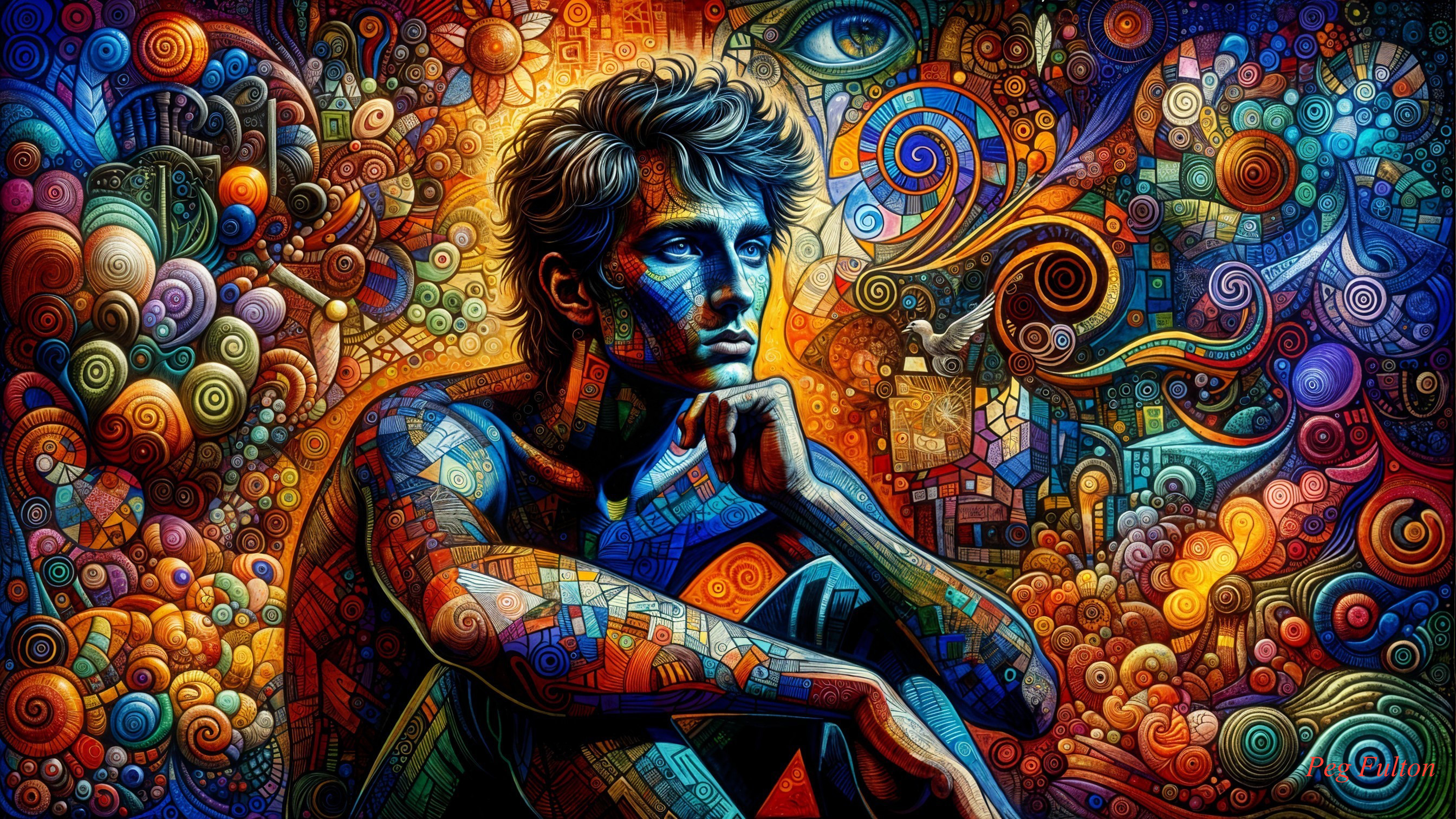 A colorful, abstract artwork featuring a contemplative figure surrounded by vibrant swirls, geometric shapes, and intricate patterns, blending human emotion with a rich, surreal landscape.