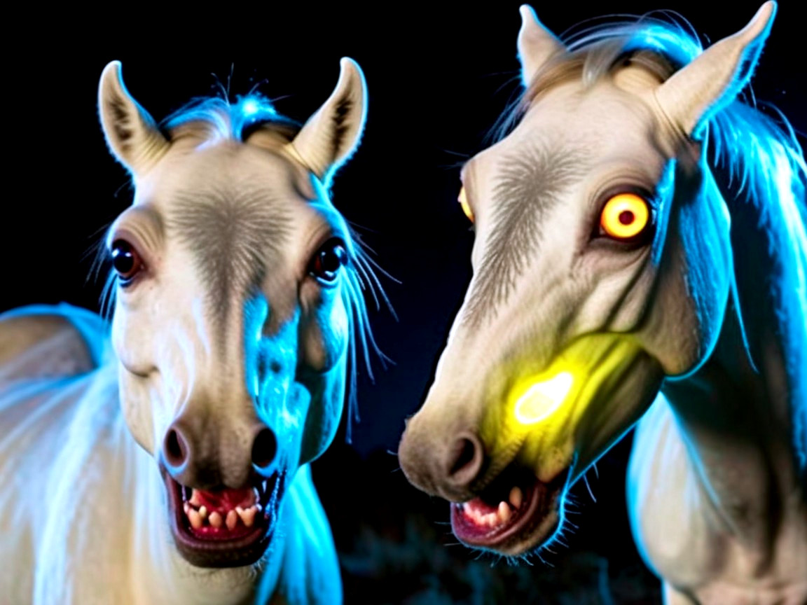 Two white horses with glowing features seen up close in the dark under a blue light. The horse on the left is facing forward, looking straight at the viewer, showing its teeth and gums in a scary expression. Its eyes are dark. The horse on the right is facing right, looking forward, also