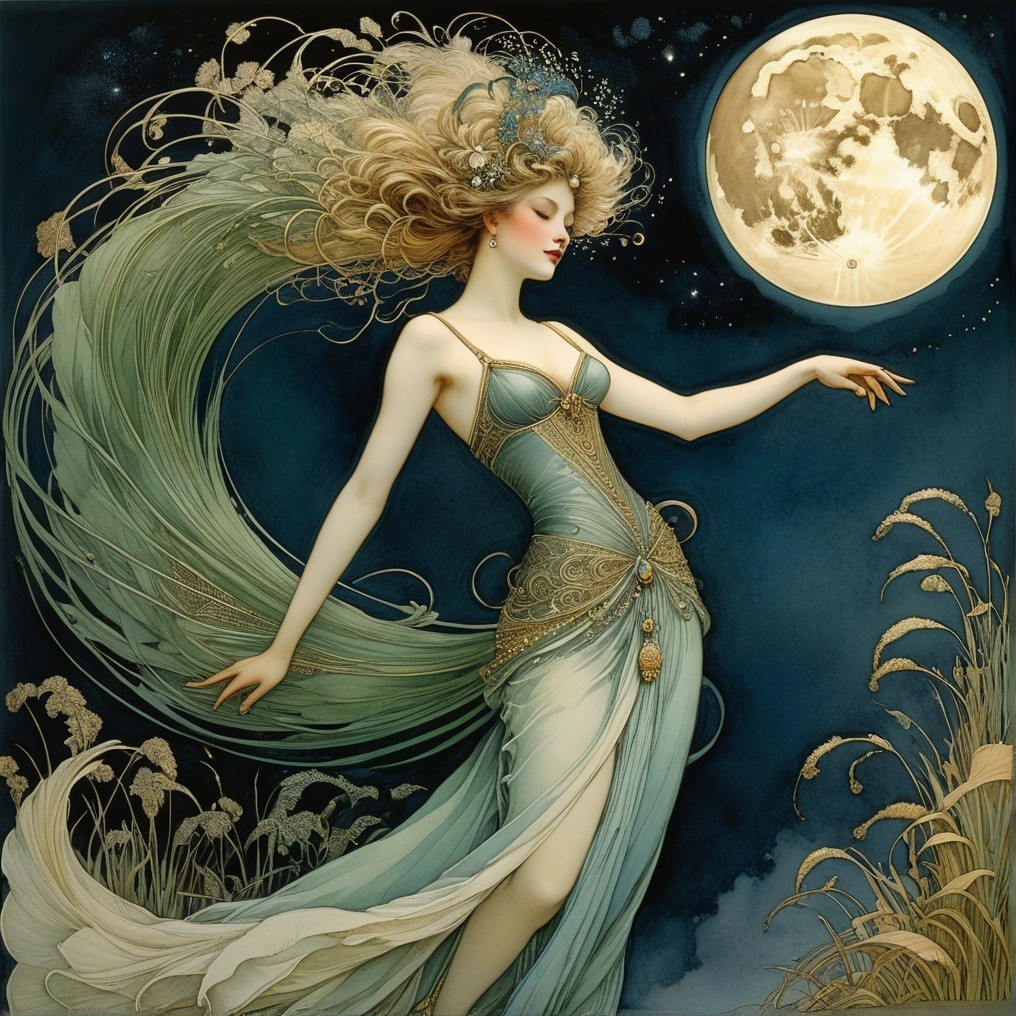 A graceful woman stands under a full moon, adorned in flowing green and white attire, with long, flowing hair. She holds a delicate wand, surrounded by nature's beauty and soft night hues.
