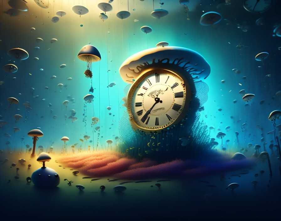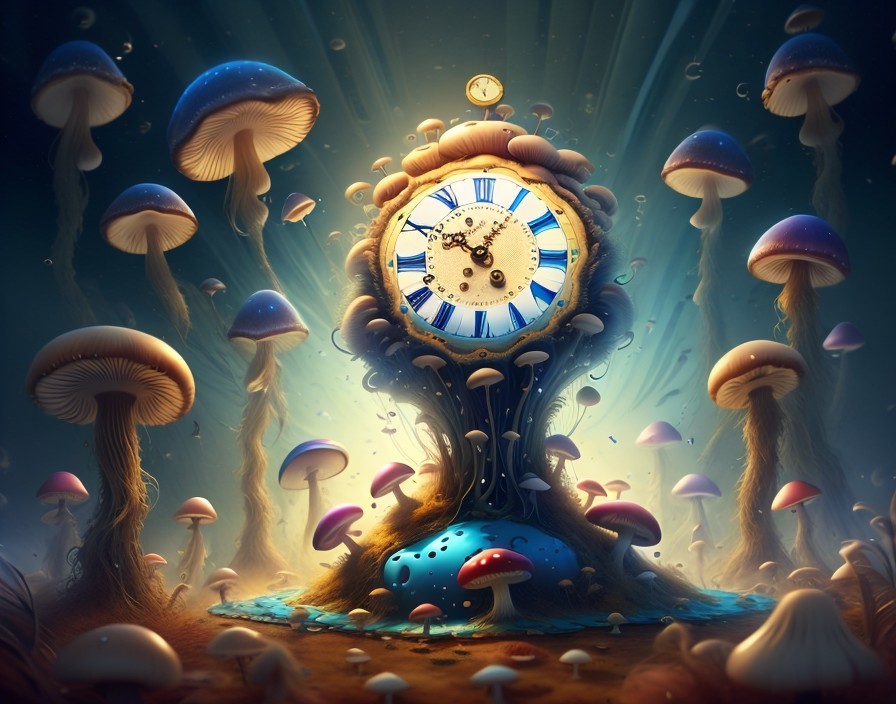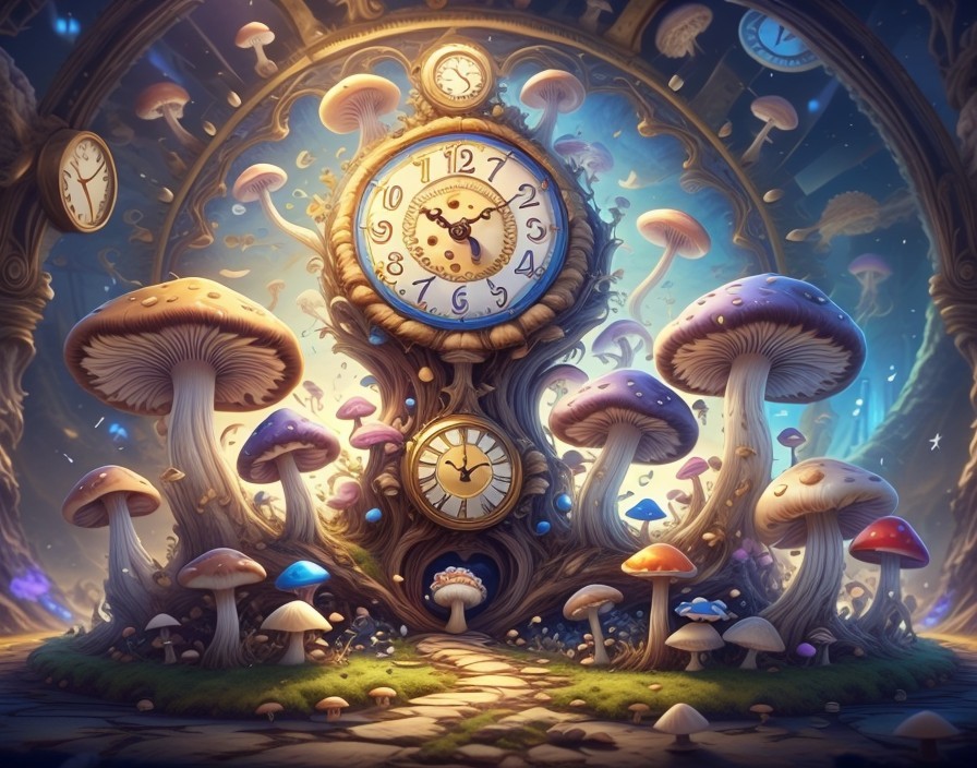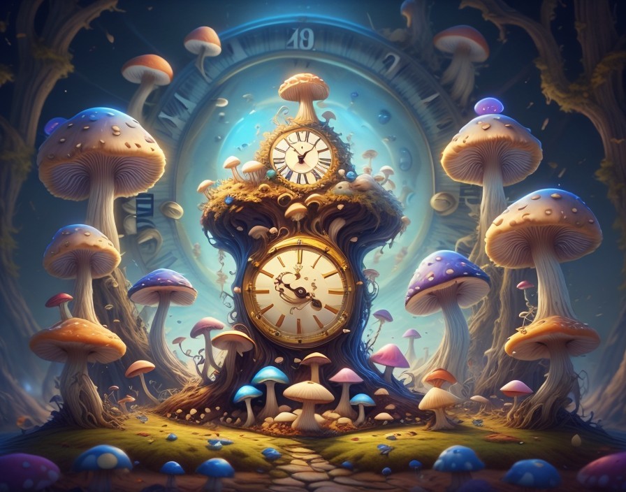 A fantastical forest filled with colorful, oversized mushrooms surrounding intricate, whimsical clock towers under a swirling sky.