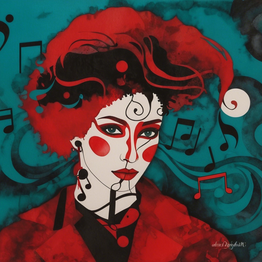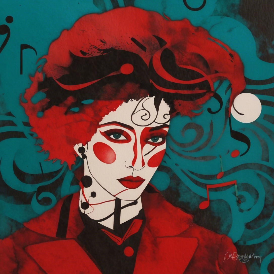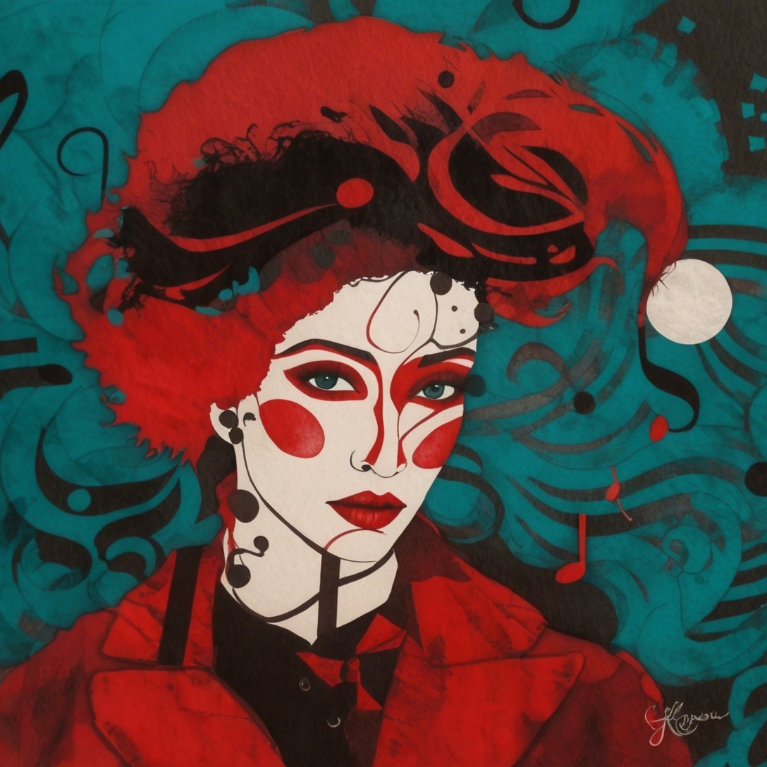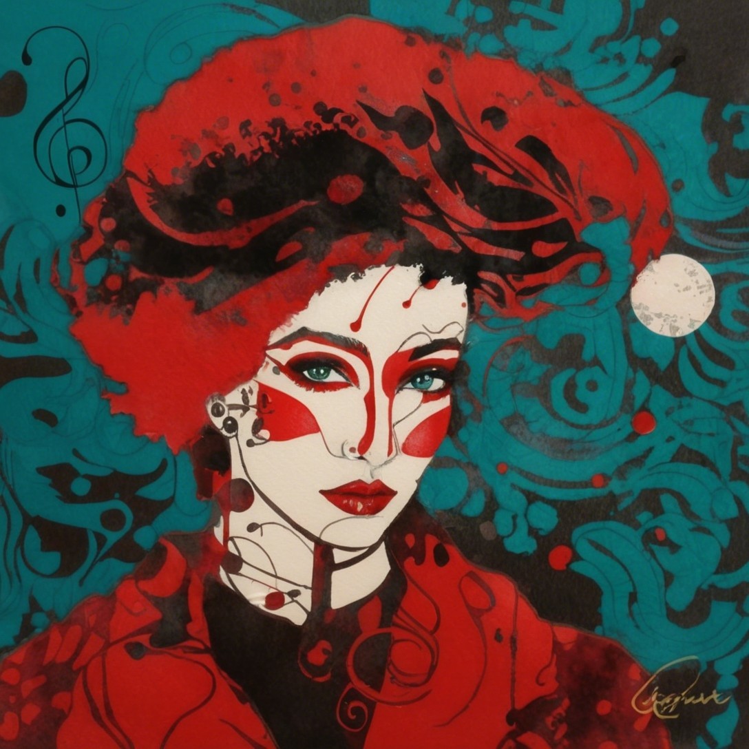 Her face blooms in winter hues—red, black, and teal—caught between emotion and melody. Swirling lines drift through her hair like thoughts in motion, while musical notes float around her as if her inner world were composing itself. This is a winter reverie made visible: a portrait where feeling, season, and sound merge into one swirling, silent song.