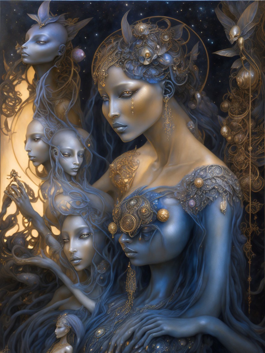 A woman in a blue dress and ornate headpiece, with a softly glowing lamp and floating orbs in a mystical, moonlit setting.
