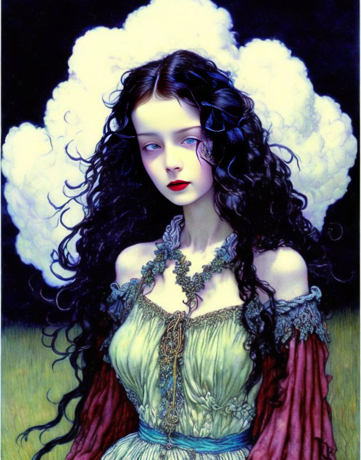 Illustrated woman with blue-black curly hair in green dress with birds on cloudy background