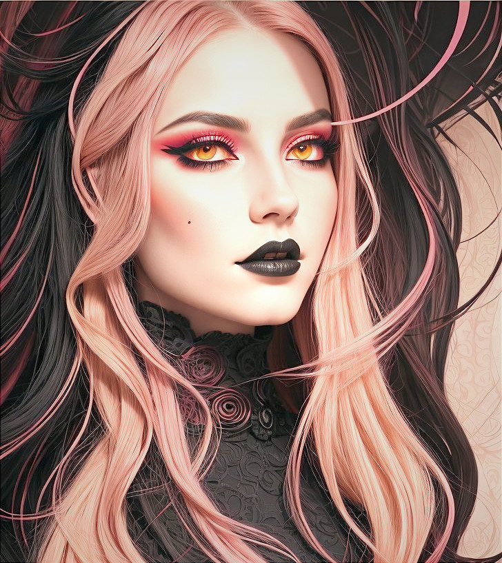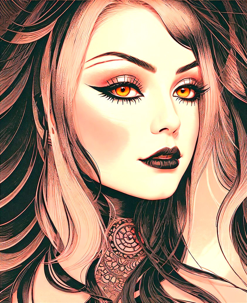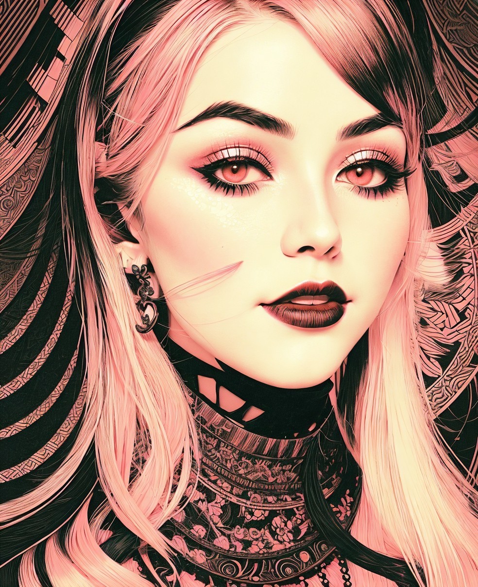 Prompt: Woodblock print, stylized Portraiture, intricate black line patterns, devilish eyes, op art details, red eyeshadow, serene expression, gothical textured background, tranquil fantasy setting, grain, stacked-up erspective, baroque painting style, red to pink color palette, orange to beige hues, vibrant pink, pink pastel tones, embossed circular and spiral patterns, glossy, cosmical, gothical surrounding theme, stylized curly long hair, modernist photographic artwork, high-resolution quality. Skin texture on face, tribal and retrofuturistuc black line designs, perfect handsface, intricate luminosity, dark fantasy inspiration, dystopian, post-apocalyptic, frayed edges, bulky black lines, thickened streaks, Novelty architecture, biomechanical elements, abstract, eerie, contemplative pose, pale skin, fabric, ethereal somber, mythical expression, dark mysterious mood, subtle reddish-brown illumination, shadowy background, stylized appearance, 3d effects 1.8, ambient occlusion 1.2, raytraced shadows 1.8, divisionism, quilling, quaint, cel-shaded, uhd, lilac, dynamic lighting 1.7, ambient occlusion 1.5, juvenile, hyper-textured colours, textured elements of kintsugi details, including pink and oxidized copper patina tracing. The backdrop is an ethereal sculpted, interspersed with fragile, otherworldly patterns and subtle bokeh effects, focus is on the intricate textures and dynamic streaks. Use vibrant colors inspired by Remedios Varo and Arlie Opal, and render the image in super detailed, high-resolution oil on a cracked intricate old Master's canvas with highly textured features overall composition by Overton Loyd and william turner.