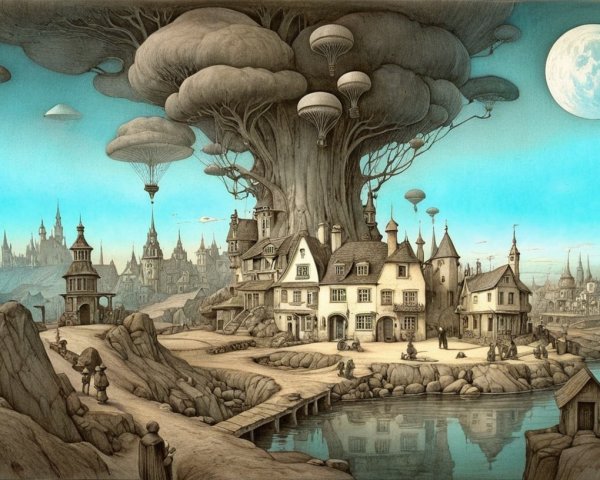 A whimsical floating castle, perched on a rocky base, features tall towers, vibrant colors, and a staircase leading to a swing. A serene night sky with a crescent moon and a distant land adds to the charm.