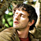 The image features a young man with striking orange highlights in his dark hair, gazing thoughtfully. Bold splashes of paint in vibrant colors add an artistic flair to the background.