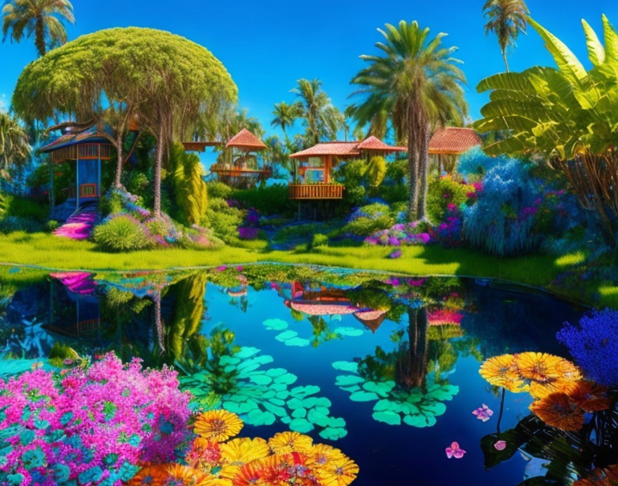 Prompt: Full page, single image, fantastic wide view, 3D watercolor patchwork, in the very best style of Gustav Klimt of an azure-colored pond reflecting a beautiful [Tingatinga style garden with tropical flowers in multiple vibrant spectacular colors, many slender palm trees, lacy ferns, and plants with delicate leaves in shades of turquoise and teal and gold], golden sunrise rays shimmering over the scene, detailed intricate, satiny, high quality, elegant, highly detailed, glistening magic style with elements in the style of Jan Toorop