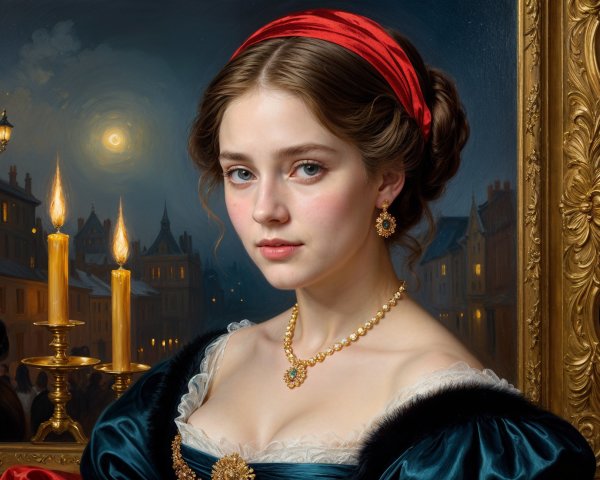A beautiful young woman poses in traditional attire, featuring a vibrant red and green outfit, intricate earrings, and a decorative bindi. The background hints at an ornate landscape.