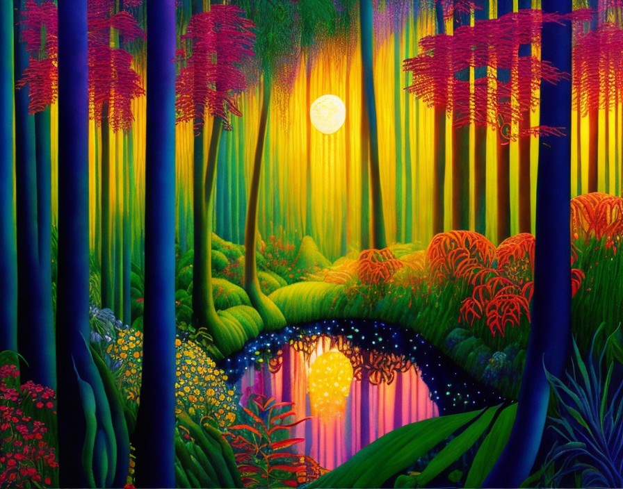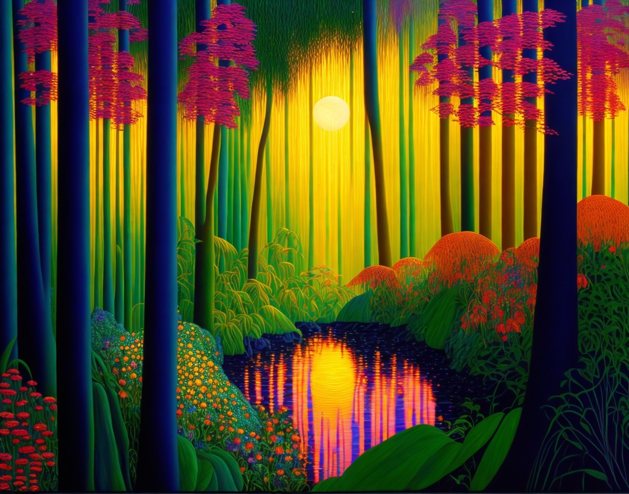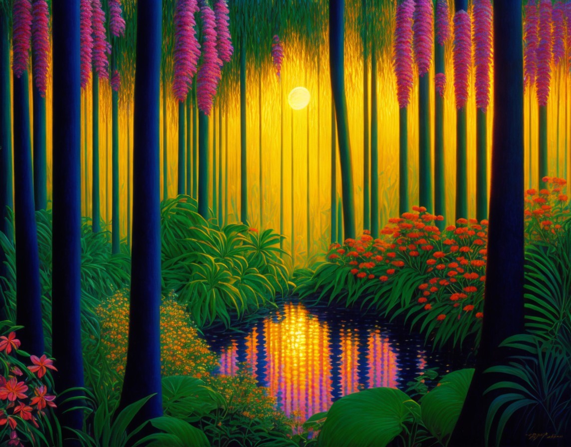 full page, single image, no mat, no frame, no angled image, no people, 3D oil, beautiful golden sunset, lush rainforest jungle, contour lighting, winding reflecting river surrounded by brightly colored flowers, delicate plants and lacy ferns, intricate, satiny, high quality, shimmering, vibrant colors, by Monet, with elements of Jan Toorop style and Gustav Klimt style