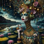 The image features two striking figures adorned in elaborate, colorful costumes, with lavish accessories and intricate hats. Their expressions are fierce yet elegant, set against a rich, vibrant backdrop.