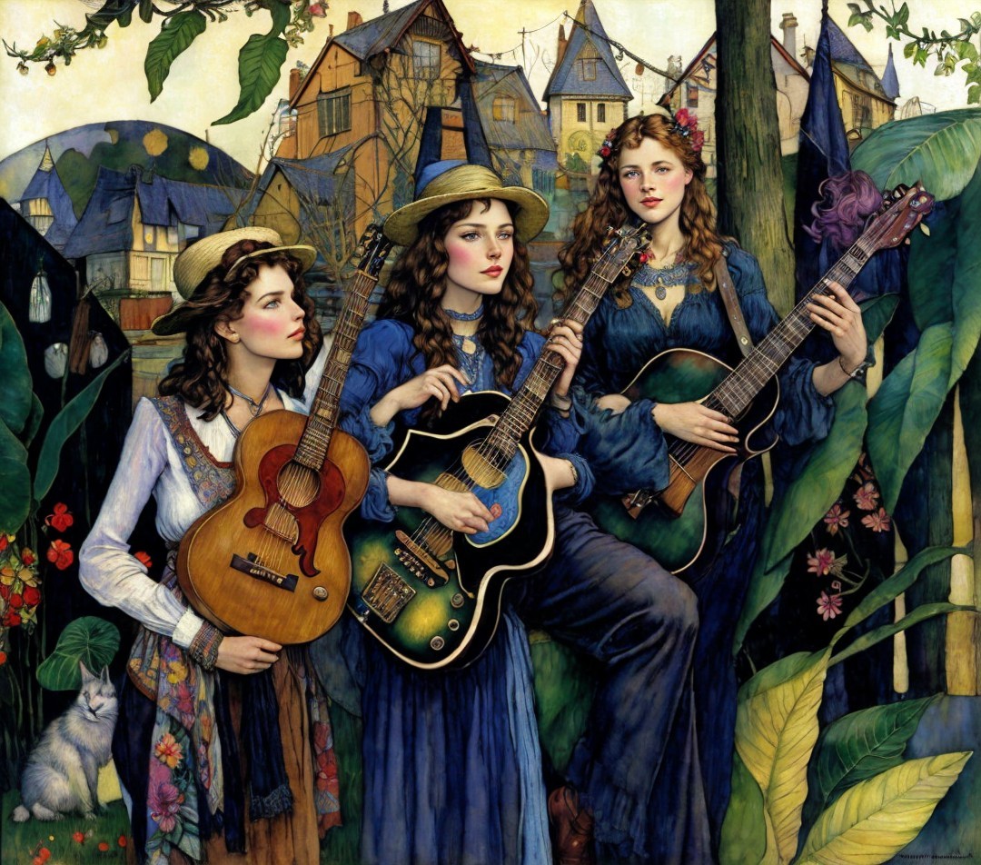 Three elegantly dressed individuals with musical instruments in a lush, vintage setting.
