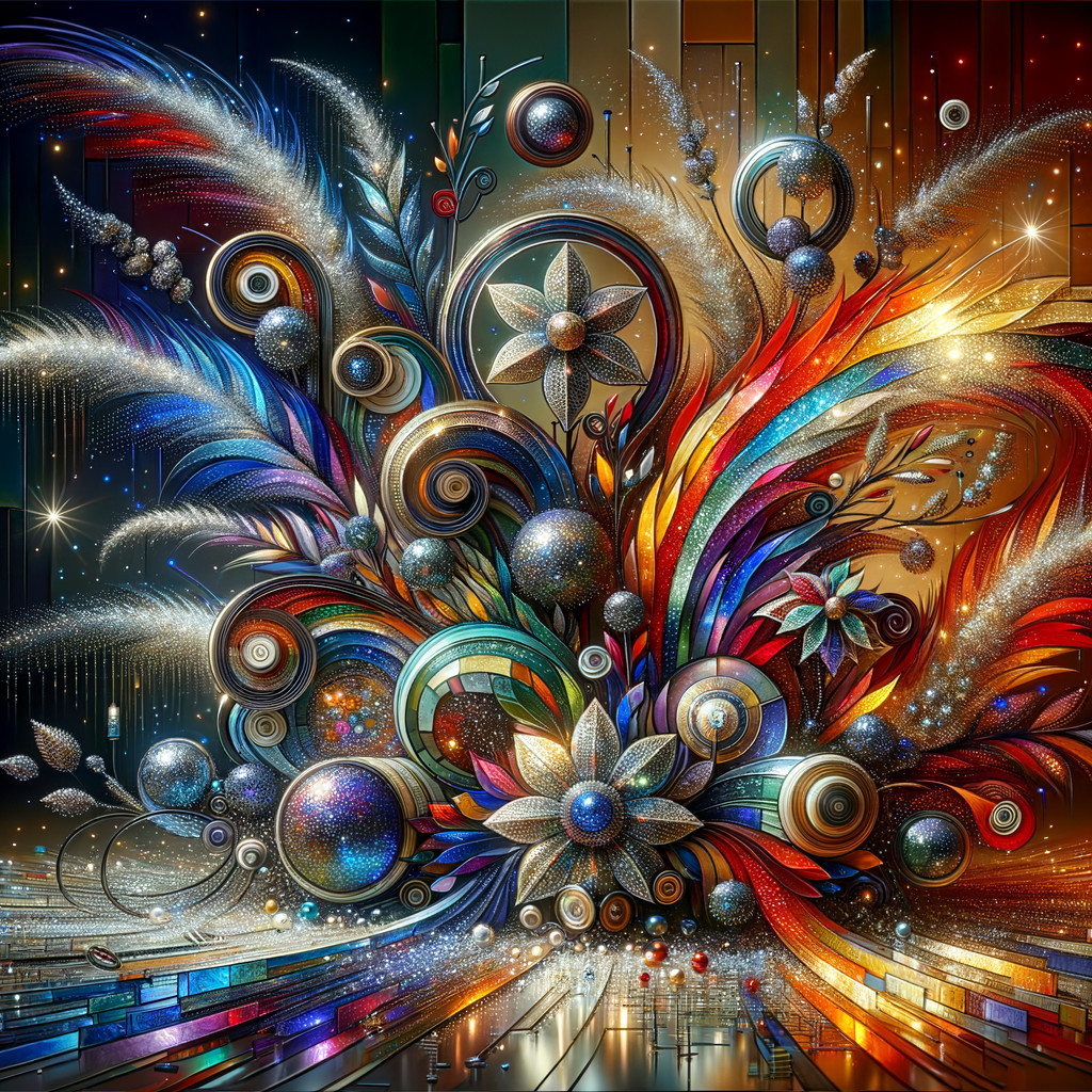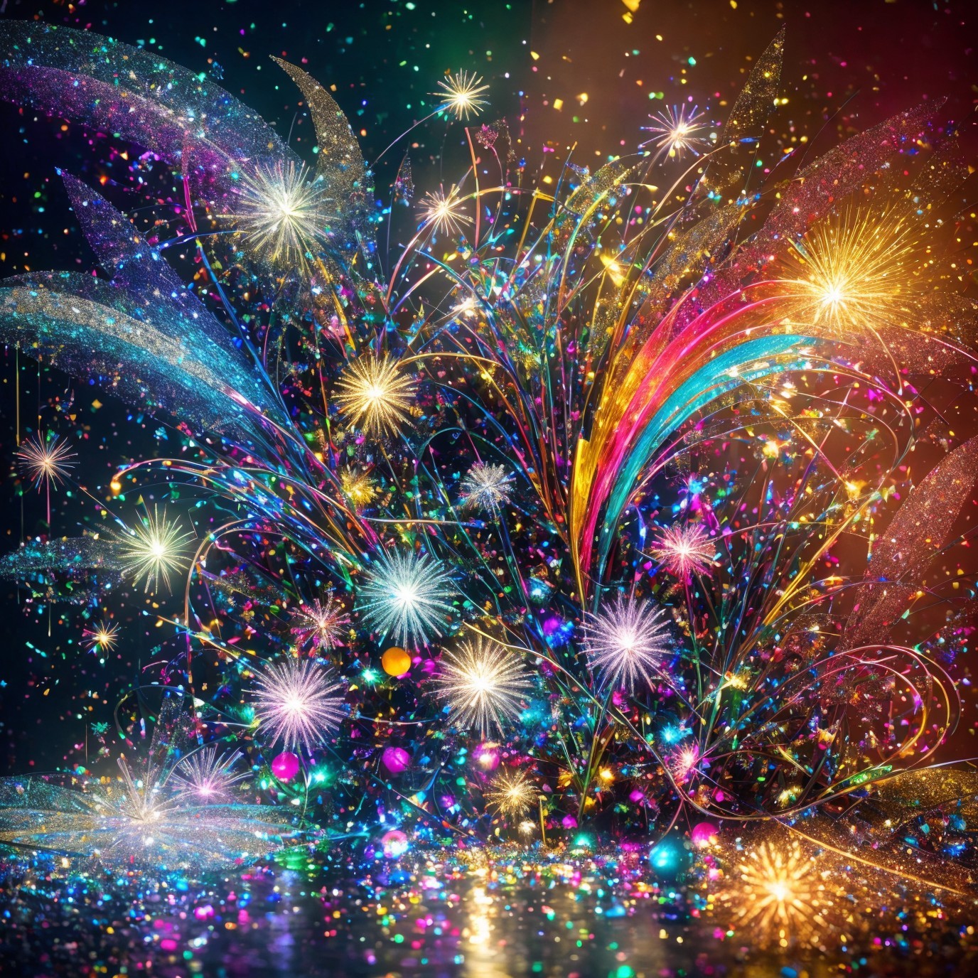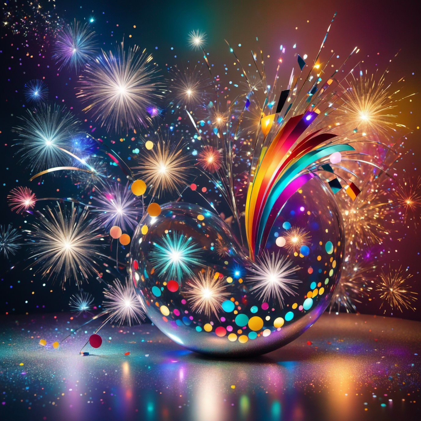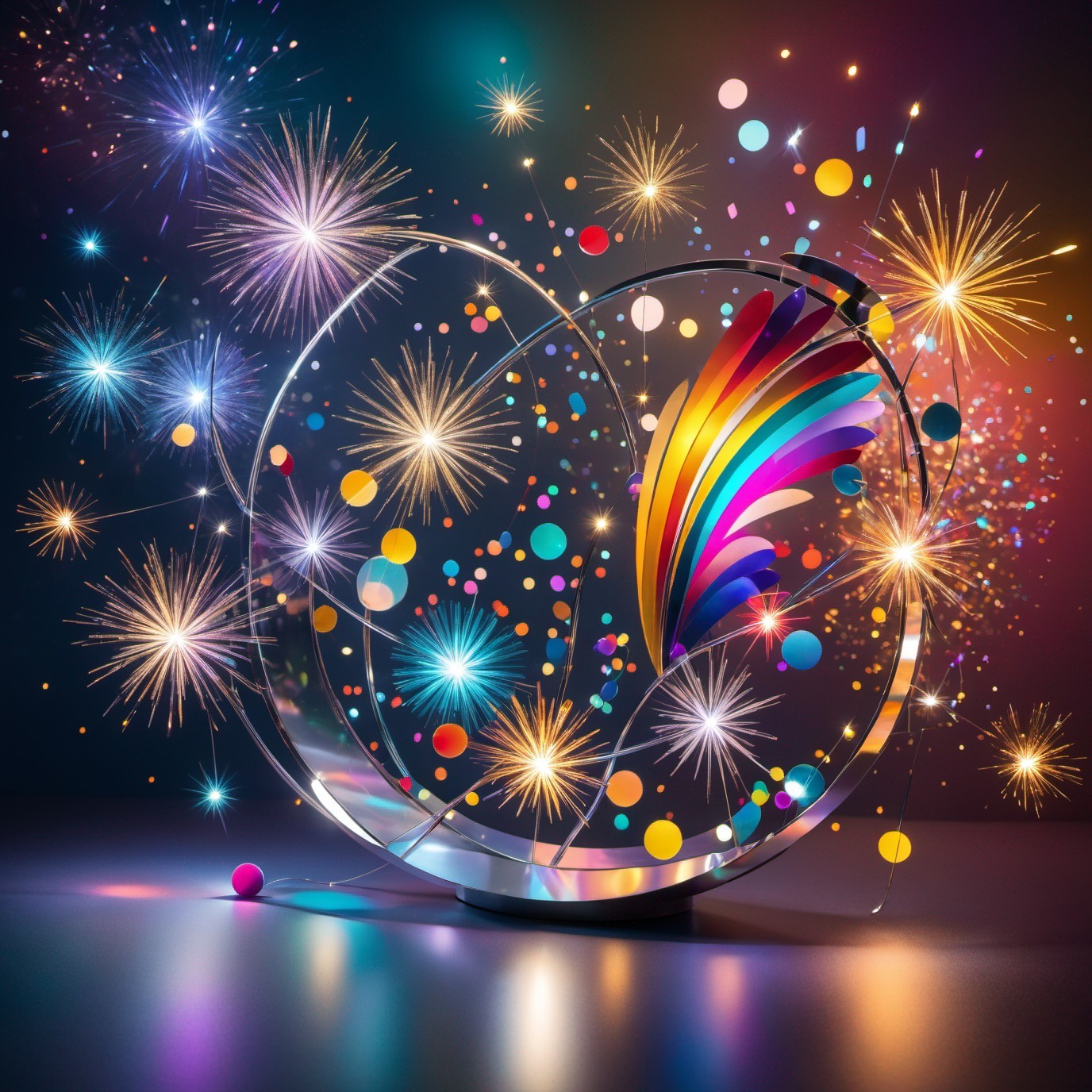 Colorful Abstract Circular Design with Fireworks and Reflective Surface