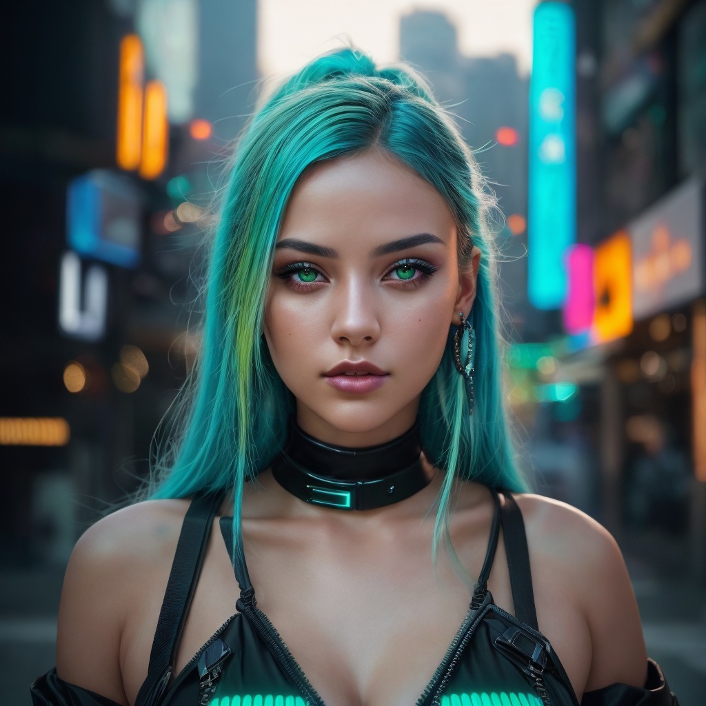 A woman with turquoise hair and futuristic attire stands before an urban cyberpunk inspired backdrop with neon lights.