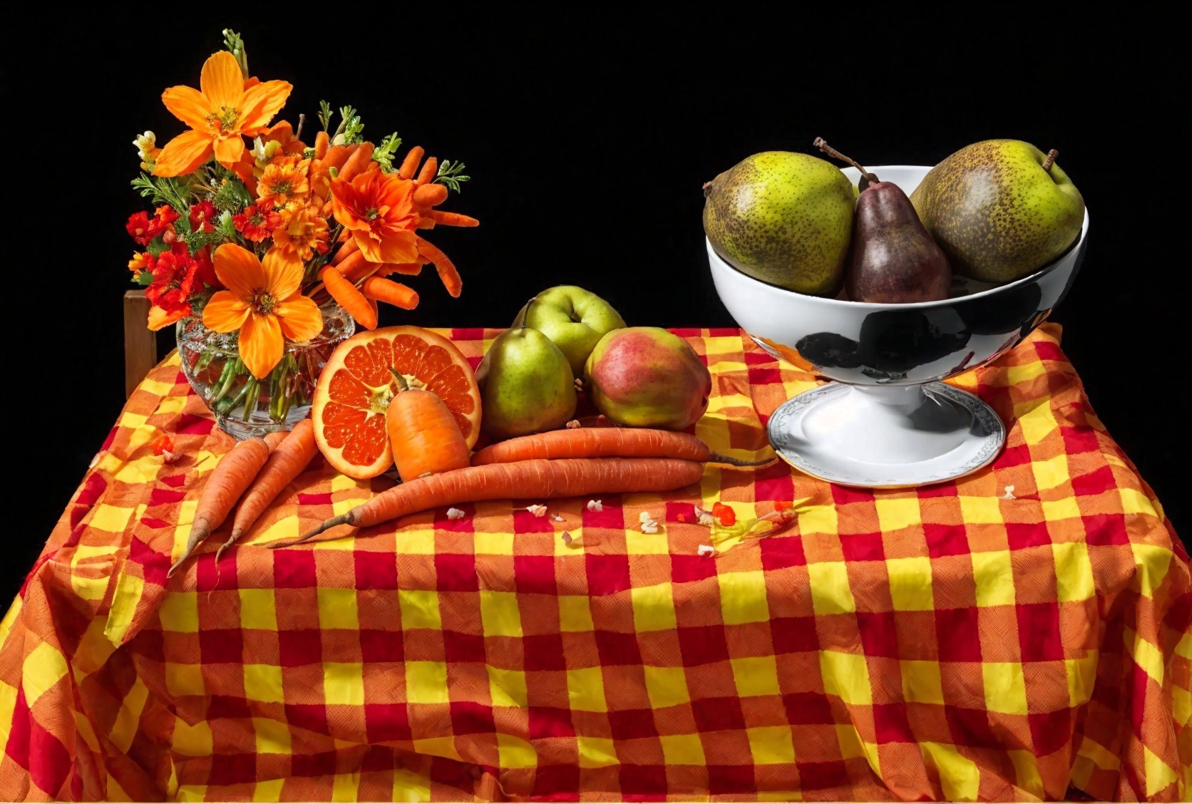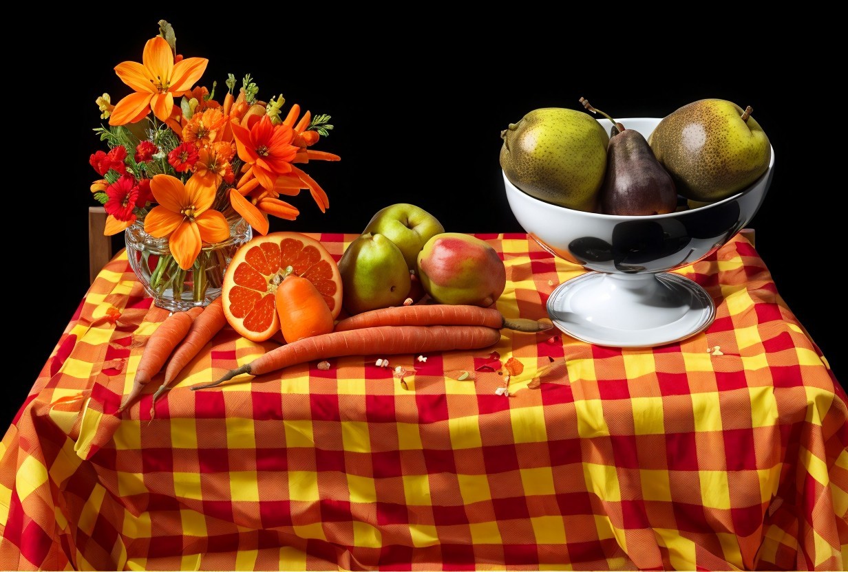 A vibrant still life featuring a chequered tablecloth. A bowl holds pears, while a variety of fruits and colorful flowers brighten the scene, adding warmth and freshness.