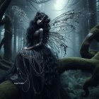 A mystical fairy with large, shimmering blue wings sits beside a tranquil forest pond. She wears an elegant dark gown adorned with flowers and glimmers, surrounded by enchanting green foliage and soft light.
