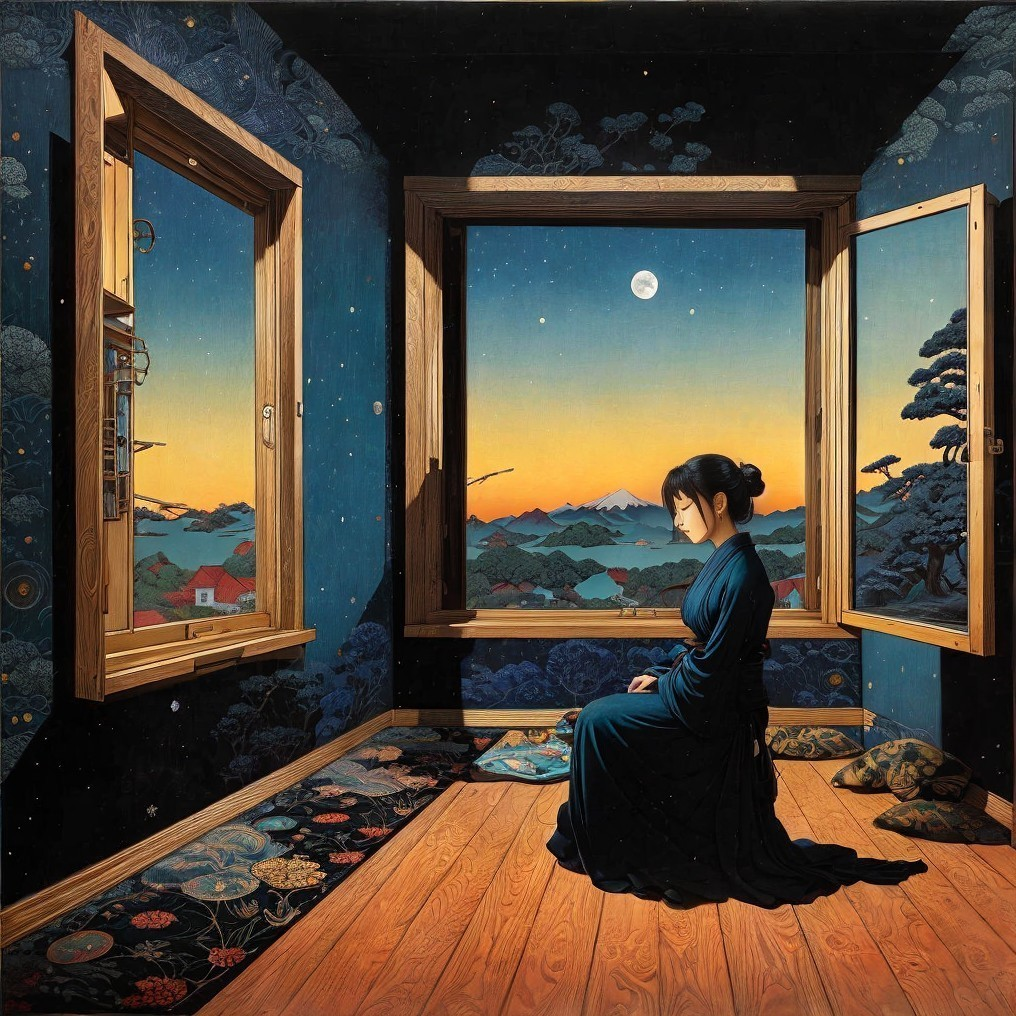 A serene woman sits in a minimalist room, framed by large windows revealing a tranquil landscape at sunset, with mountains in the distance and her pottery around her.