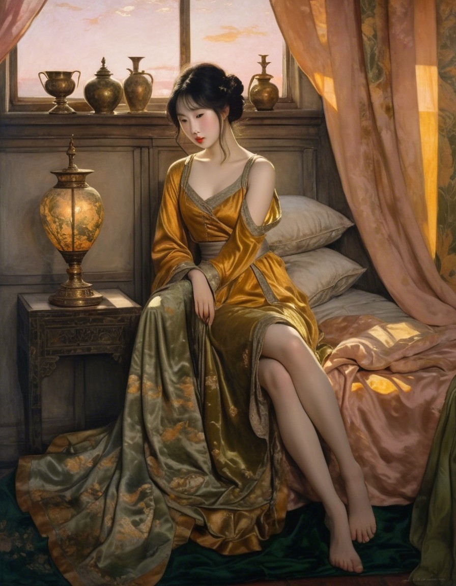 + Prompt:Girl in a beautiful boudoir at sunset, 3rd century Chinese miniature art, Velvet blush olive green, sage, Shabby, Dull Gold, Amber Gray, marbled. dramatic