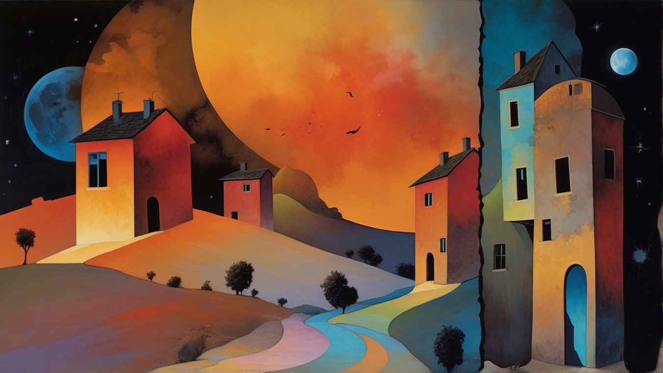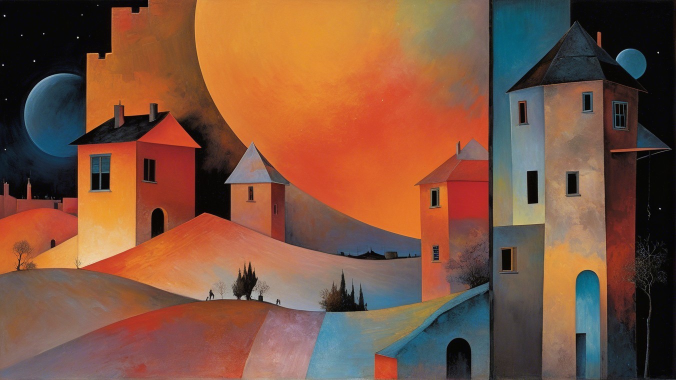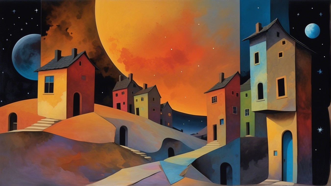 Surreal Landscape with Abstract Houses and Vibrant Sky