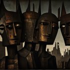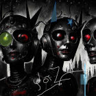 The image features a striking assembly of four humanoid figures with dark, futuristic designs. Each has unique, vivid eye colors and metallic elements, blending cybernetic and artistic styles.