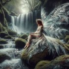 A serene scene featuring a woman in a shimmering teal dress sitting on a mossy rock by a tranquil river, surrounded by lush greenery and cascading waterfalls. Sunlight filters through the trees.