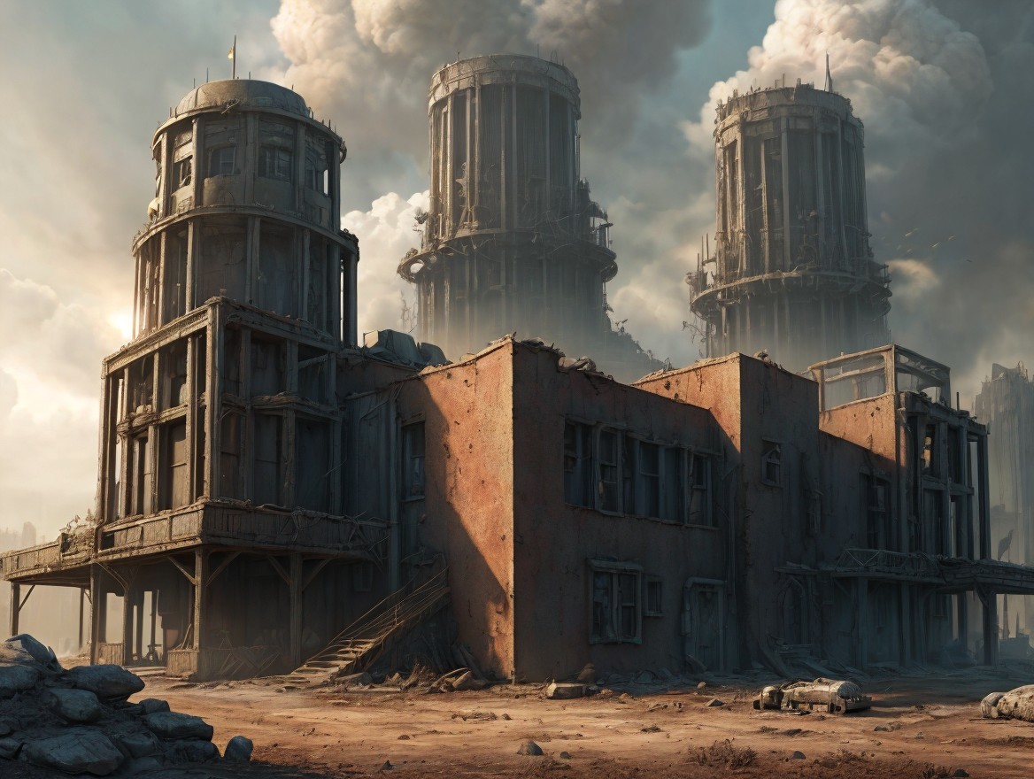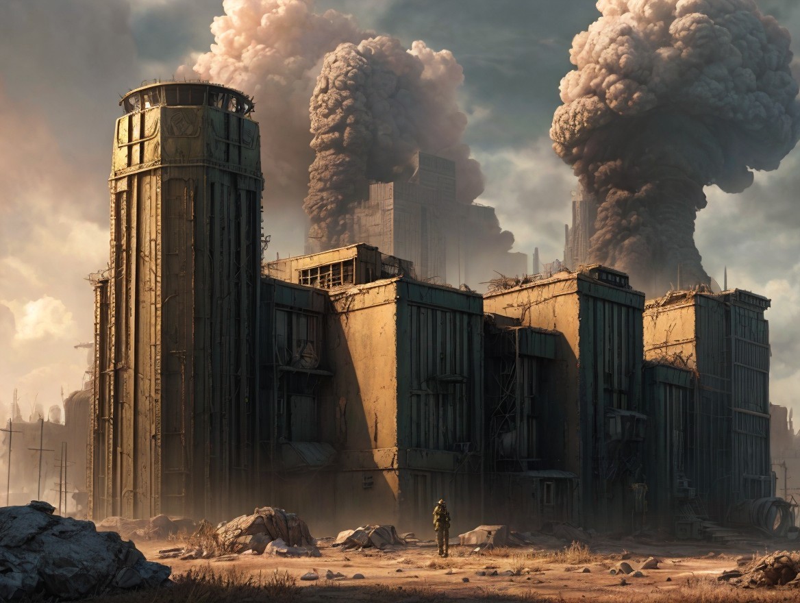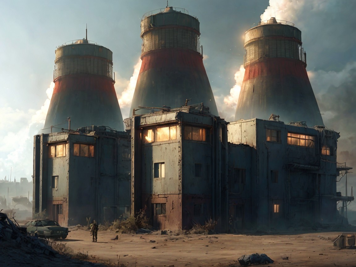 A massive, industrial facility dominates the landscape, with towering smokestacks and billowing clouds. Figures in protective gear stand in the foreground, highlighting a gritty, futuristic setting.