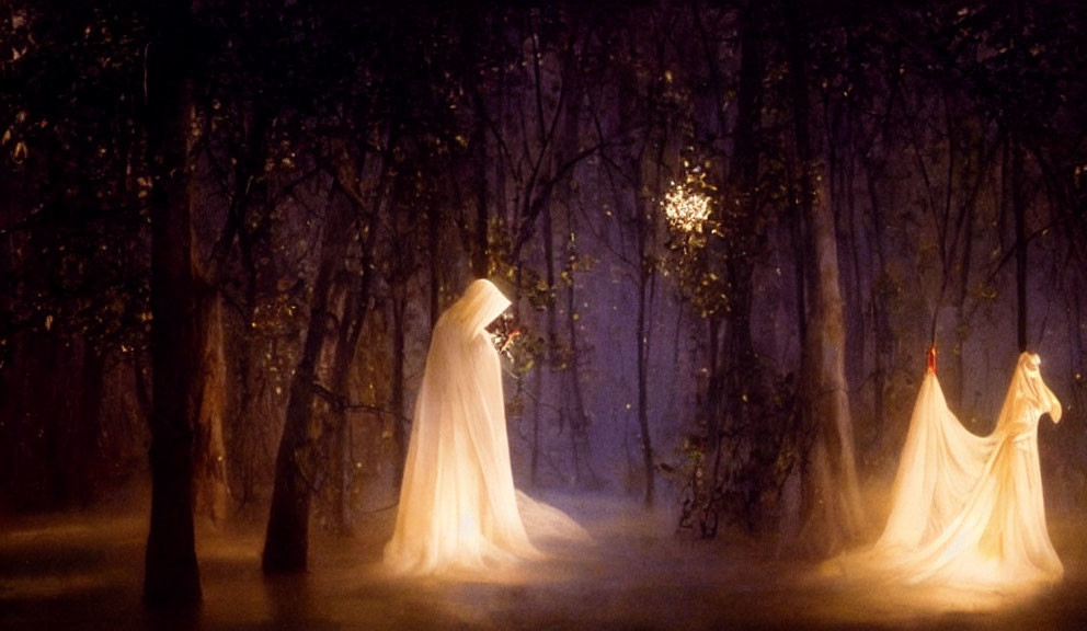 Full body portrait of a woman, her face covered by a white veil, face under a white veil, face hidden under white fabric, wading through a flooded forest with red flowers popping out of the trees and lights glowing in the background. Reflections in the water. Pre-Raphaelite. George Méliès. Harry Clarke. Mucha. Mist, misty, fog, foggy.