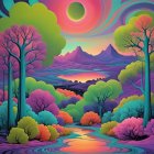A vibrant, surreal landscape features colorful trees and mountains under a swirling sky. A glowing sun reflects on a peaceful river, with lush foliage creating a dreamlike atmosphere.