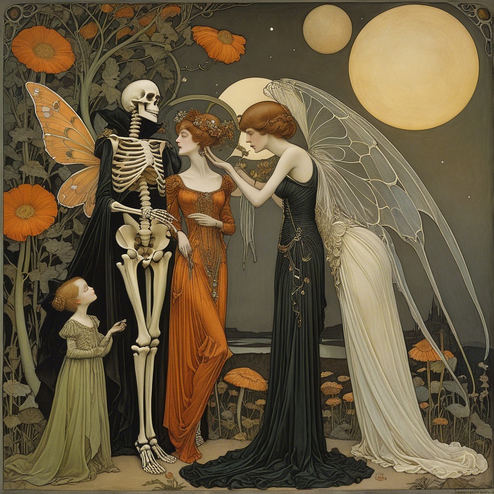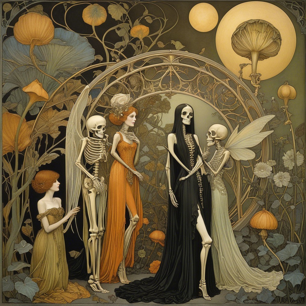 Prompt: Delicate art nouveau fairy skeleton. Reverie of delicacy. Hallucinogenic, psychedelic decay and a little bit of Necromancy.