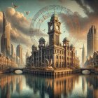 Grateful thanks and credit to Bee-folco, for a fascinating prompt, which i used, to go off on a tangent. A vibrant cityscape at sunset features a grand clock tower beside modern skyscrapers. Soft clouds and swirling patterns enhance the skyline, while birds soar above a serene river reflecting the colours of nature.