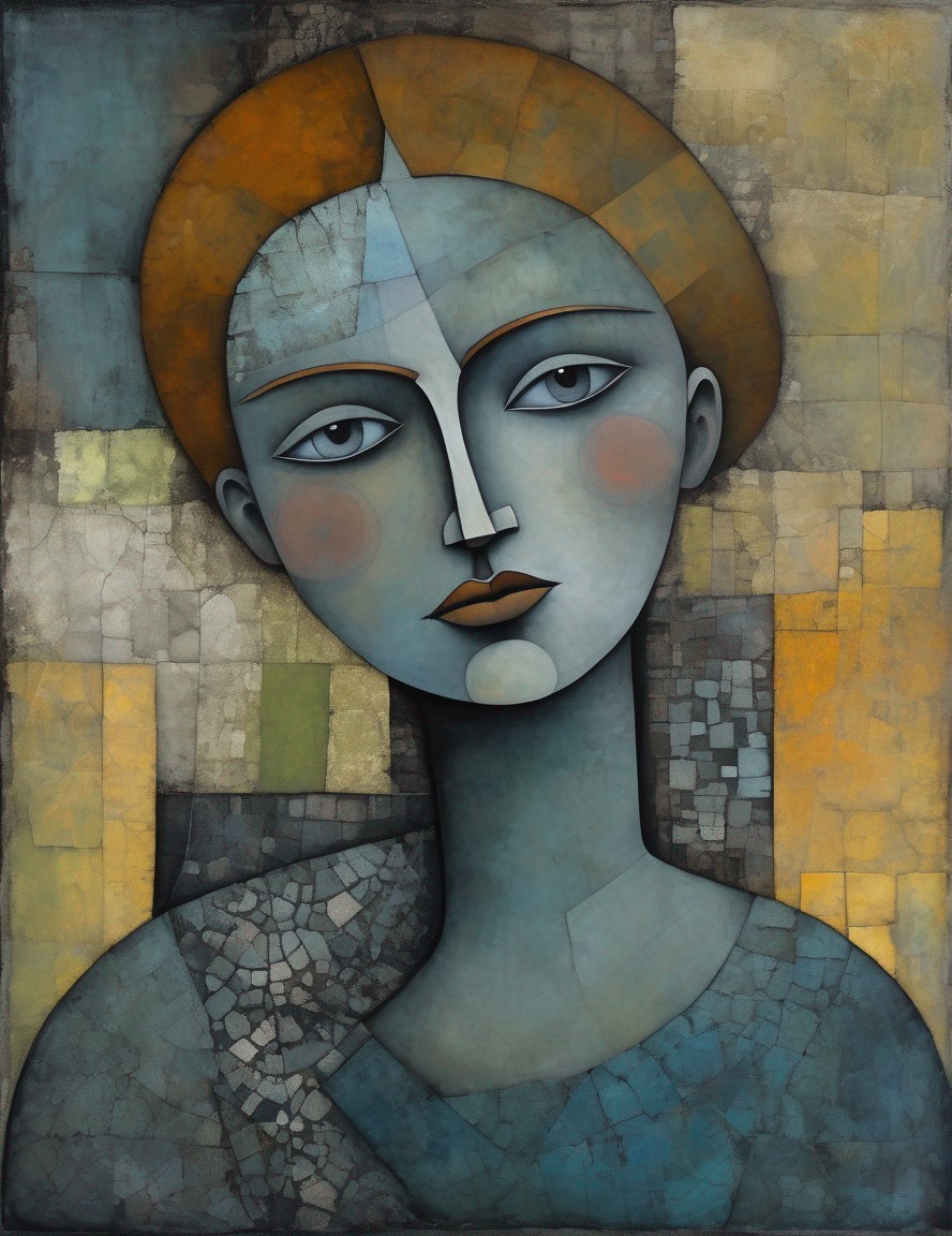 A painting of a stylized face with geometric shapes and a cubist influence in a muted color palette.