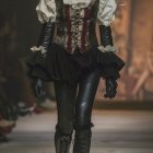 A woman in a gothic-inspired outfit features a striking crimson and black corset with puffy sleeves, complemented by glossy black leggings and elegant accessories. The setting appears dark and atmospheric.