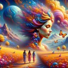 Dreamy Landscape with Serene Woman and Colorful Figures