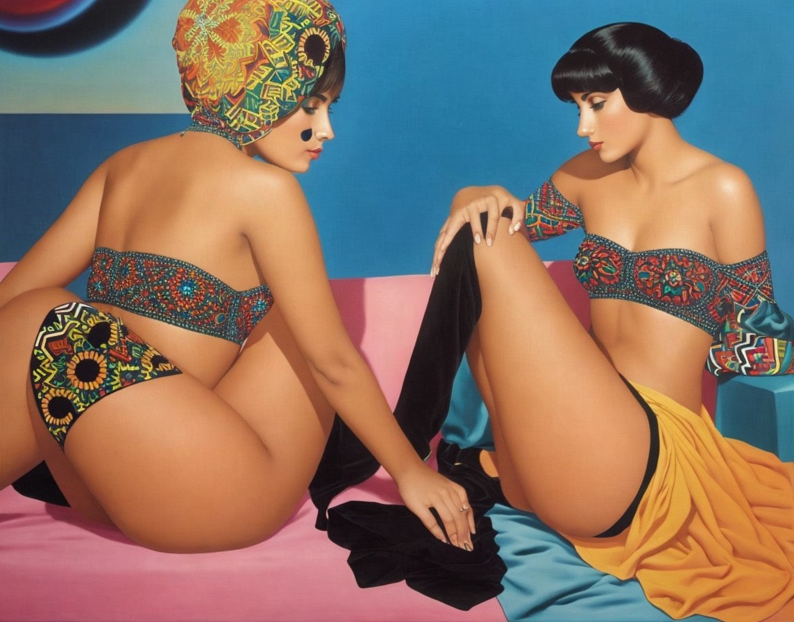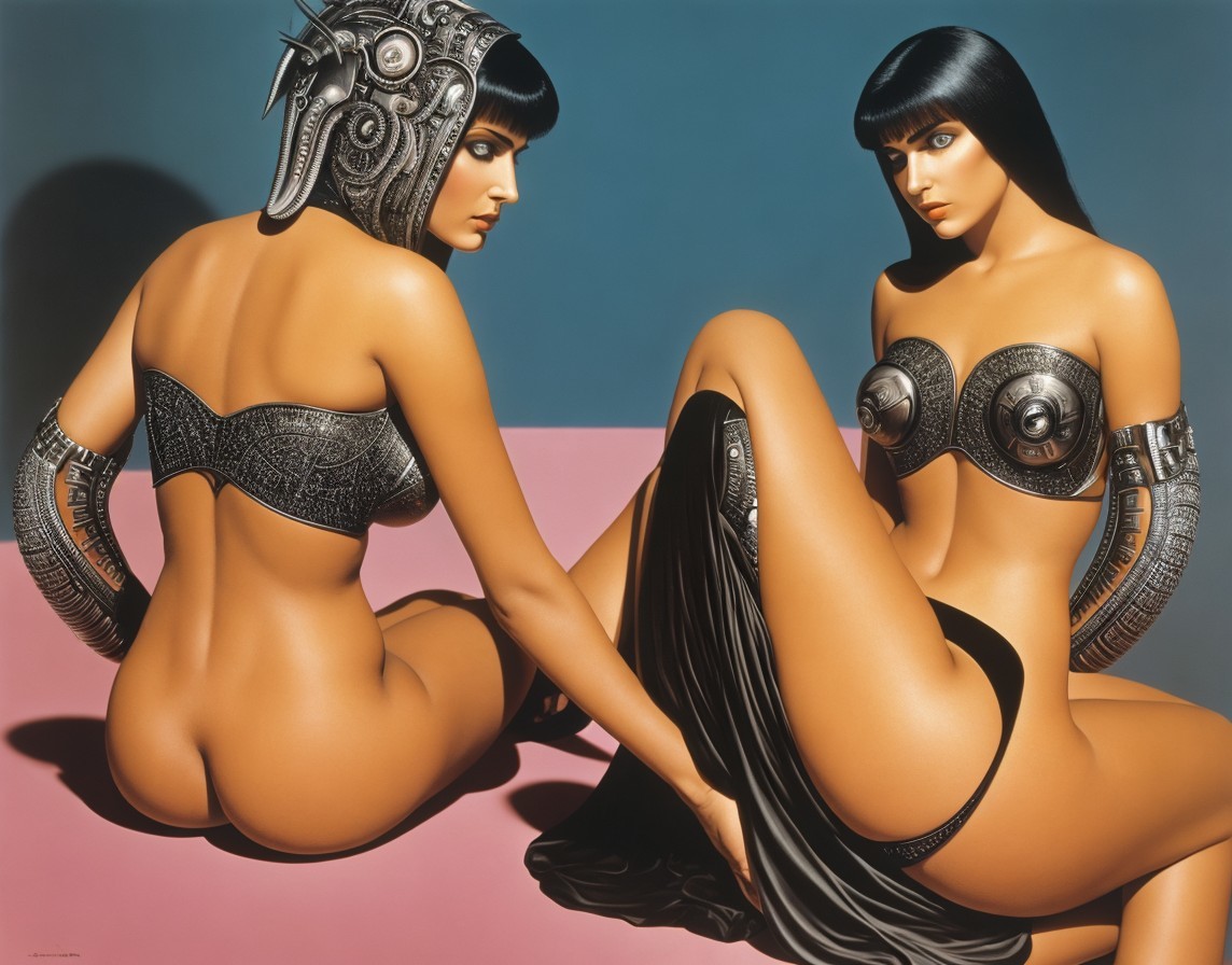Two stylized women with dark hair, wearing futuristic black bodysuits with cut-outs, are seated back-to-back against a pinkish background.