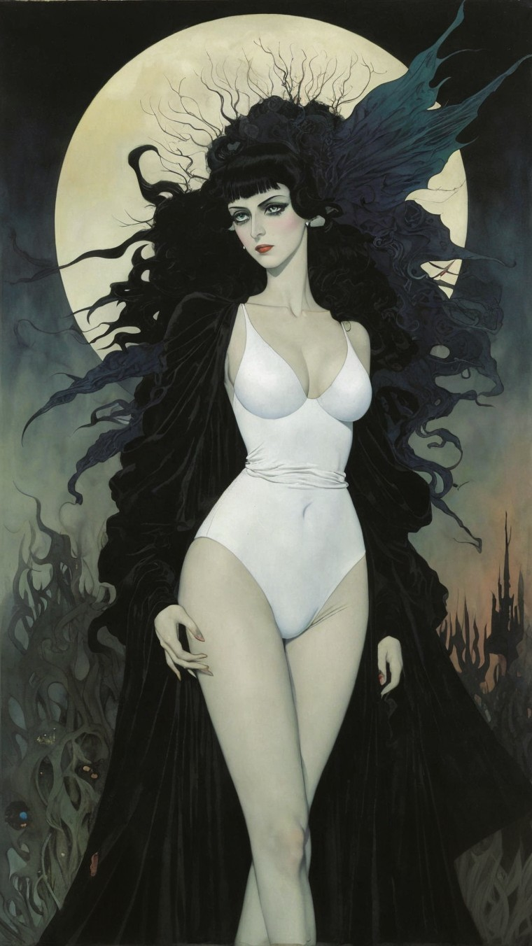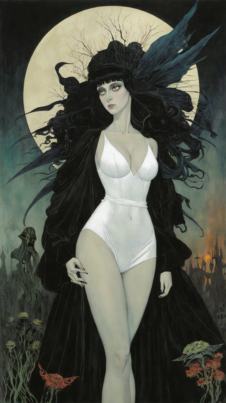 Ink and oil on canvas. In the style of Jean "Moebius" Giraud, Leonora Carrington, Boris Vallejo, German Expressionism, Felicien Rops, (((Georgia O'Keefe))) and Aubrey Beardsley.