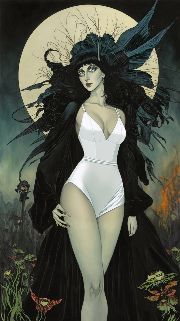 Prompt: Sickened and diseased waif. Buxom and voluptuous. Mystified mystic eyes. Ink and oil on canvas. In the style of Jean "Moebius" Giraud, (((Leonora Carrington))), Boris Vallejo, German Expressionism, Felicien Rops, (((Georgia O'Keefe))) and (((Aubrey Beardsley))). Ensure all significant elements remain within boundaries. .The bestest picture ever as if Satan did it. The highest of the high quality images,