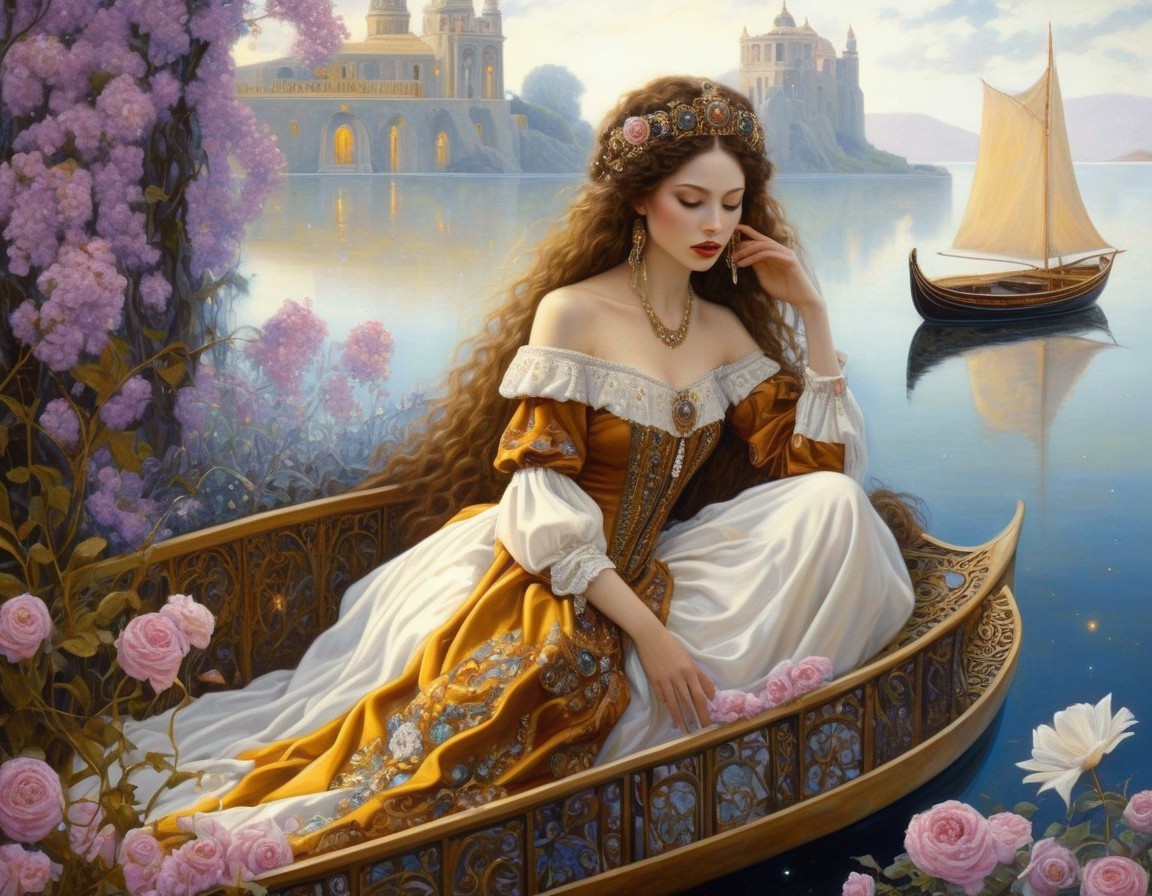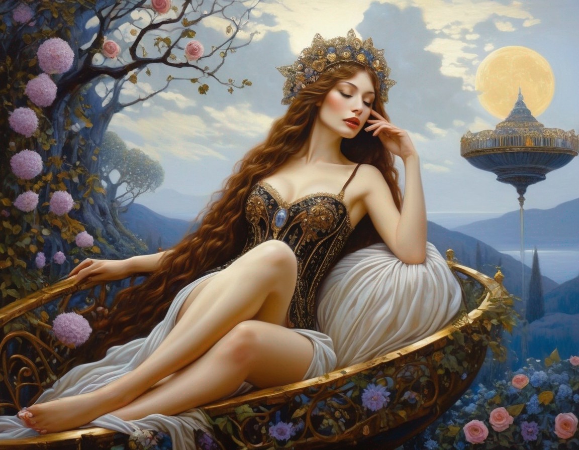 A regal woman in a bejeweled crown and blue gown sits thoughtfully on an ornate chair under a full moon amidst blooming trees.